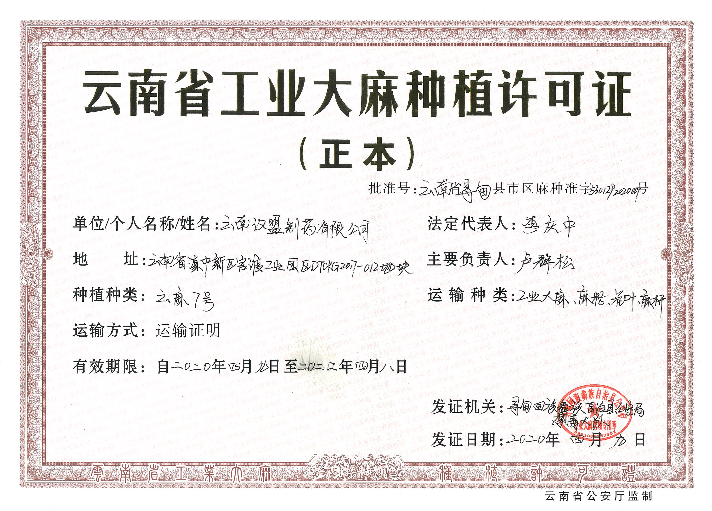 On April 9, 2020, Yunnan Hempmon Pharmaceuticals Co., Ltd. (hereinafter referred to as “Hempmon CZ”) successfully obtained the hemp planting permit to cultivate Yunnan Hemp No.7 issued by Anti-Drug Brigade of Public Security Bureau of Xundian Hui and Yi Autonomous County, Yunnan Province.